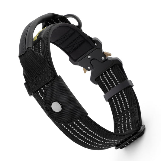 Plutus Pet Tactical Dog Collar with Tracker Packet for AirTag, Adjustable Reflective Nylon Collar, Metal Buckle, Leather-Wrapped Handle, Soft Padded for Medium Large Dogs (Orange, L)