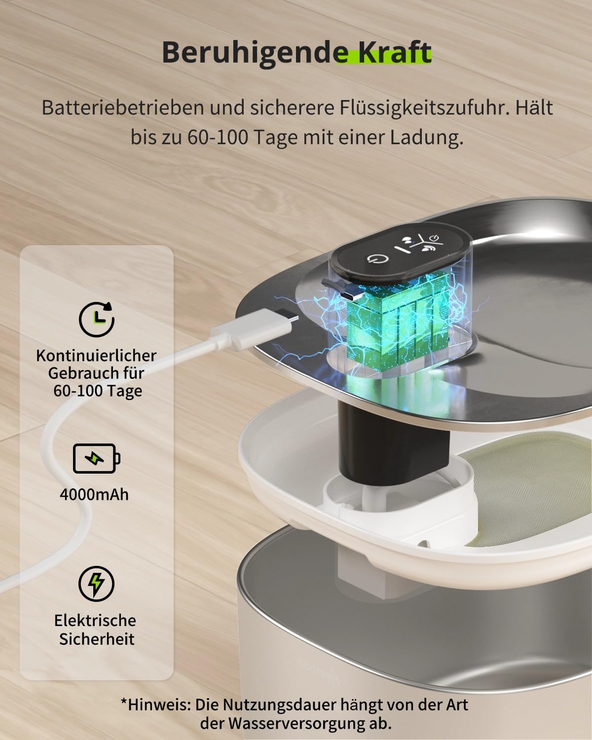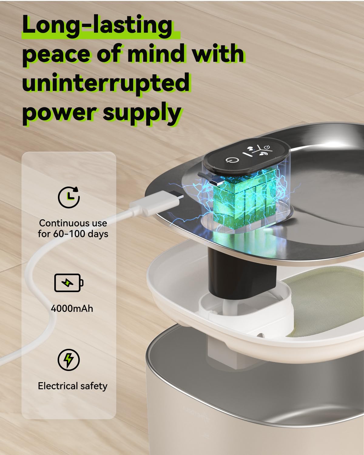 - [Time to Get Rid of Tangled Wires] APETDOLA wireless cat water fountain allows you to place it anywhere you want: your kitchen, bedroom, balcony, or beyond. Safety design no need to plug in, shake off the cords trouble. Battery operated cat fountain has a high capacity 4000mAh battery with life is up to 60-100 days! Never worried about cats or dogs running out of water during power-outage or short-trip. You can also clearly see how much water is left through the water level window.