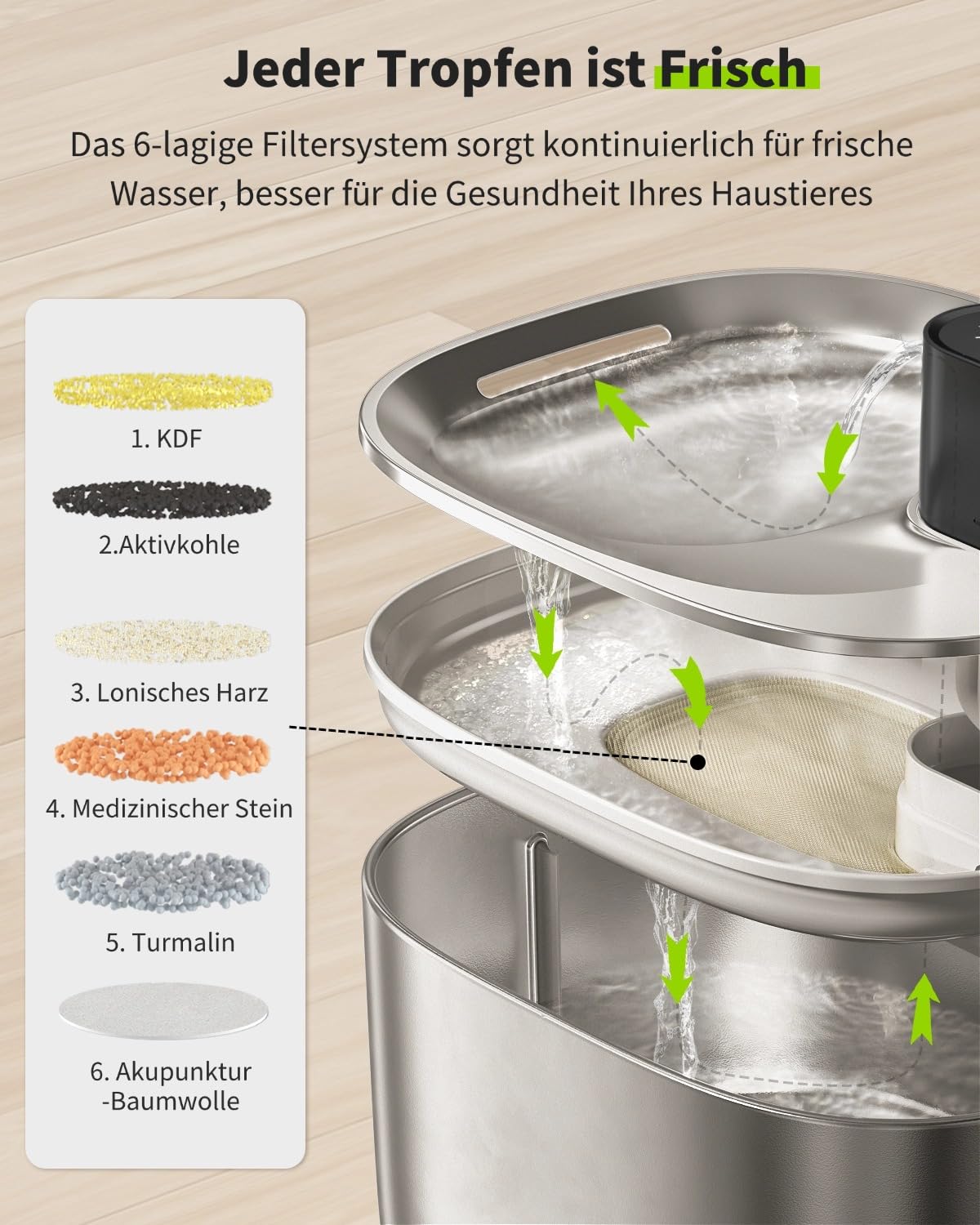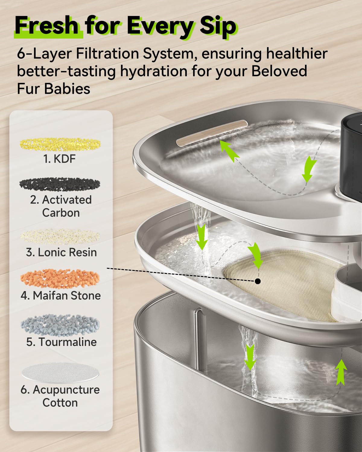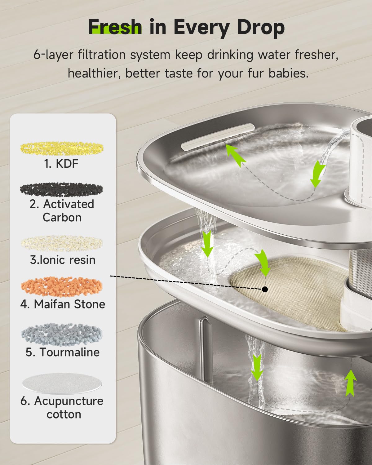 - [Freshness in Every Sip] Every drop of water is filtered through this 6-layer vertical filtration system of APETDOLA cat fountain water bowl, so that your cats can get oxygen-enriched and better-tasting water, no hair, sediment, dirt and so on. Made of filter sponge, KDF, Ion Exchange Resin, Quartz Sand, Coconut Activated Charcoal and Cotton. Please replace the pre-filter sponge once a week. Please replace the filter every 2 weeks (15 days).