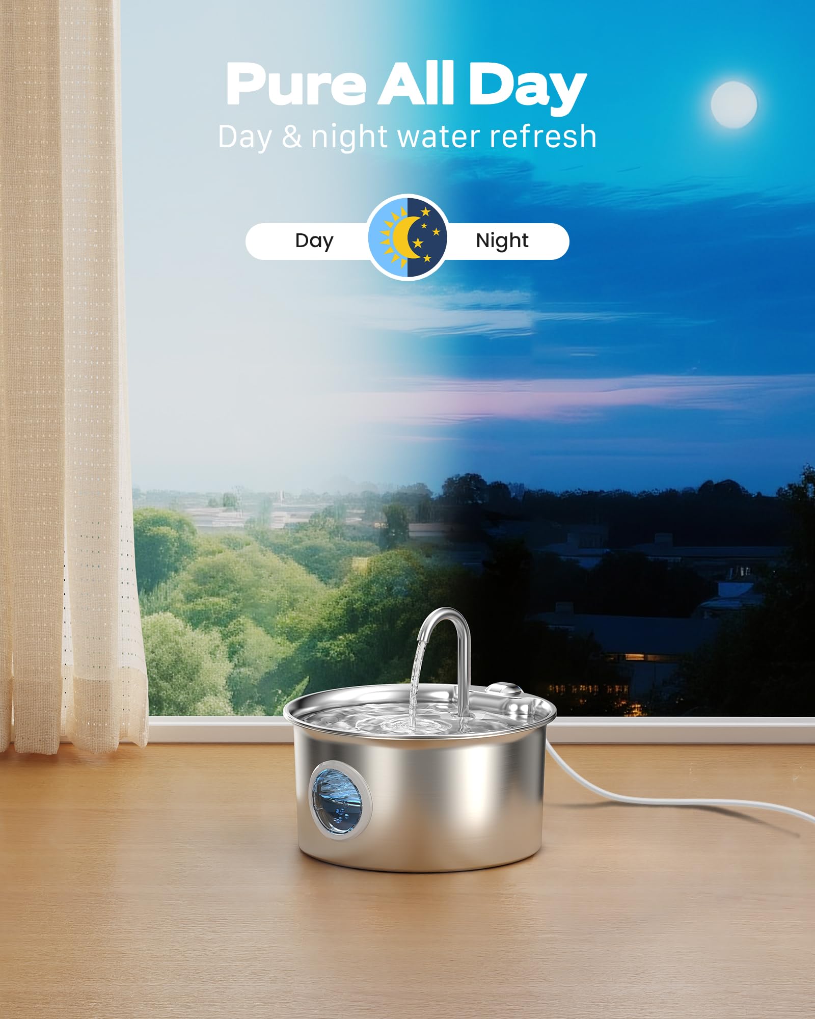 - Clear View, Easy Refills - This stainless steel pet water fountain features a transparent water-level window, allowing you to check the remaining water at a glance—no need to open the lid. You can promptly replenish fresh water for your beloved pet. Additionally, this helps you accurately monitor your pet's daily water intake.