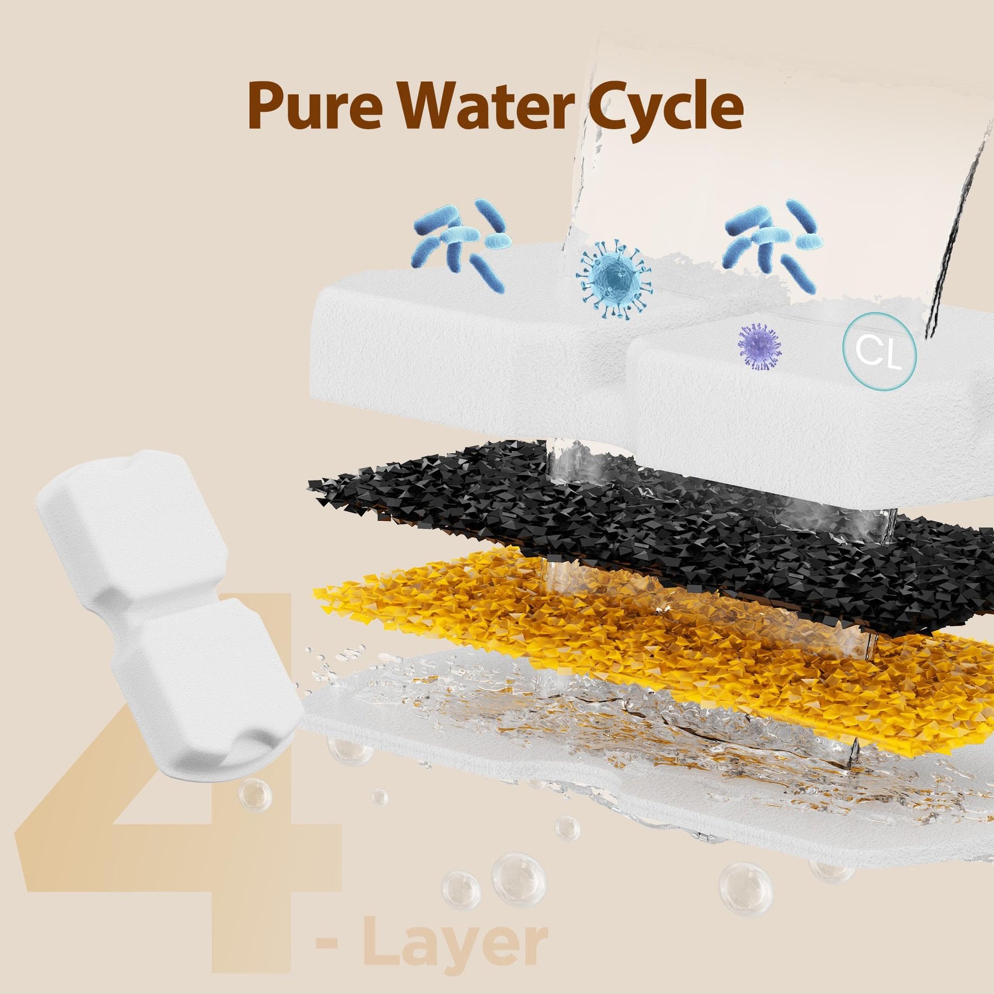 - Purity in Every Drink - This water fountain cat bowl features a 4-stage filtration system to keep every sip clean: activated carbon removes odors, ion exchange resin softens the water, multi-layered non-woven fabric traps hair and debris, while high-density sponge filters out tiny particles. Provide fresh water for your furry friend.