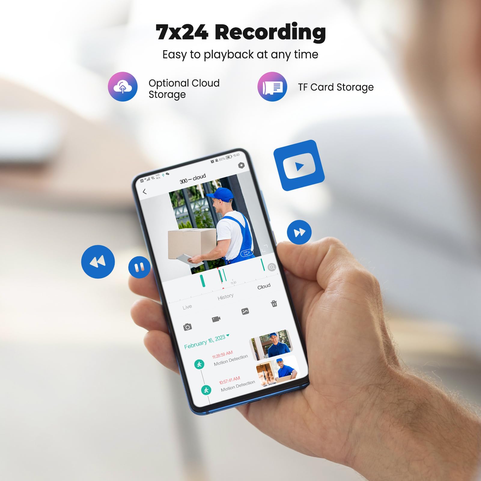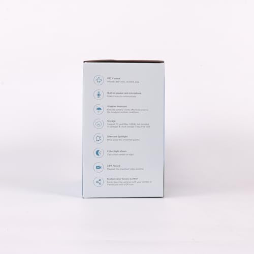 - 360° PTZ View & 7/24 Recording: The security camera outdoor is equipped with PTZ function, through the camera application you can control the camera to adjust the viewing angle. The maximum horizontal can reach 355°, the vertical 90°. It monitors indoors for you in all directions, and there is no dead spot outdoors. Keep your family safe.