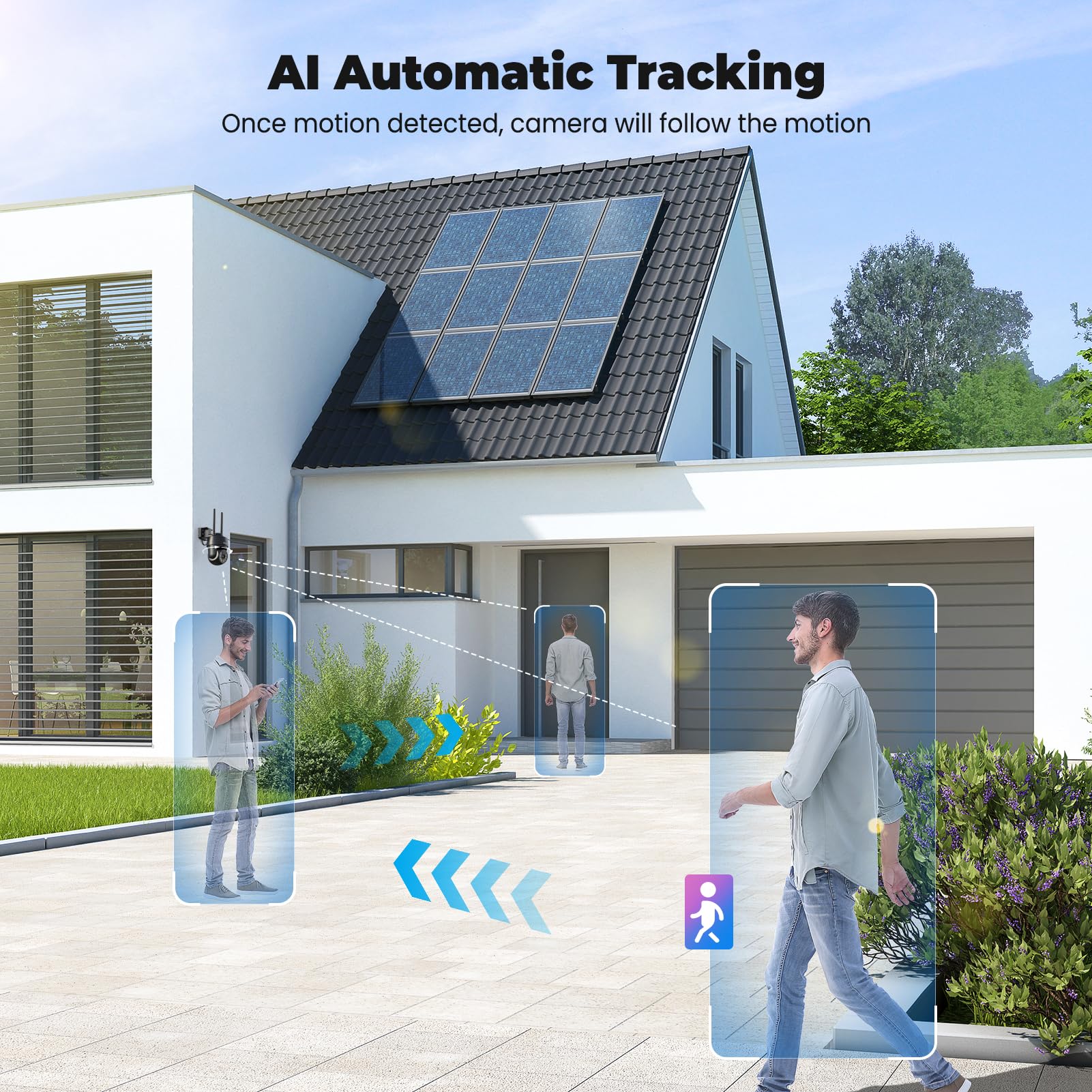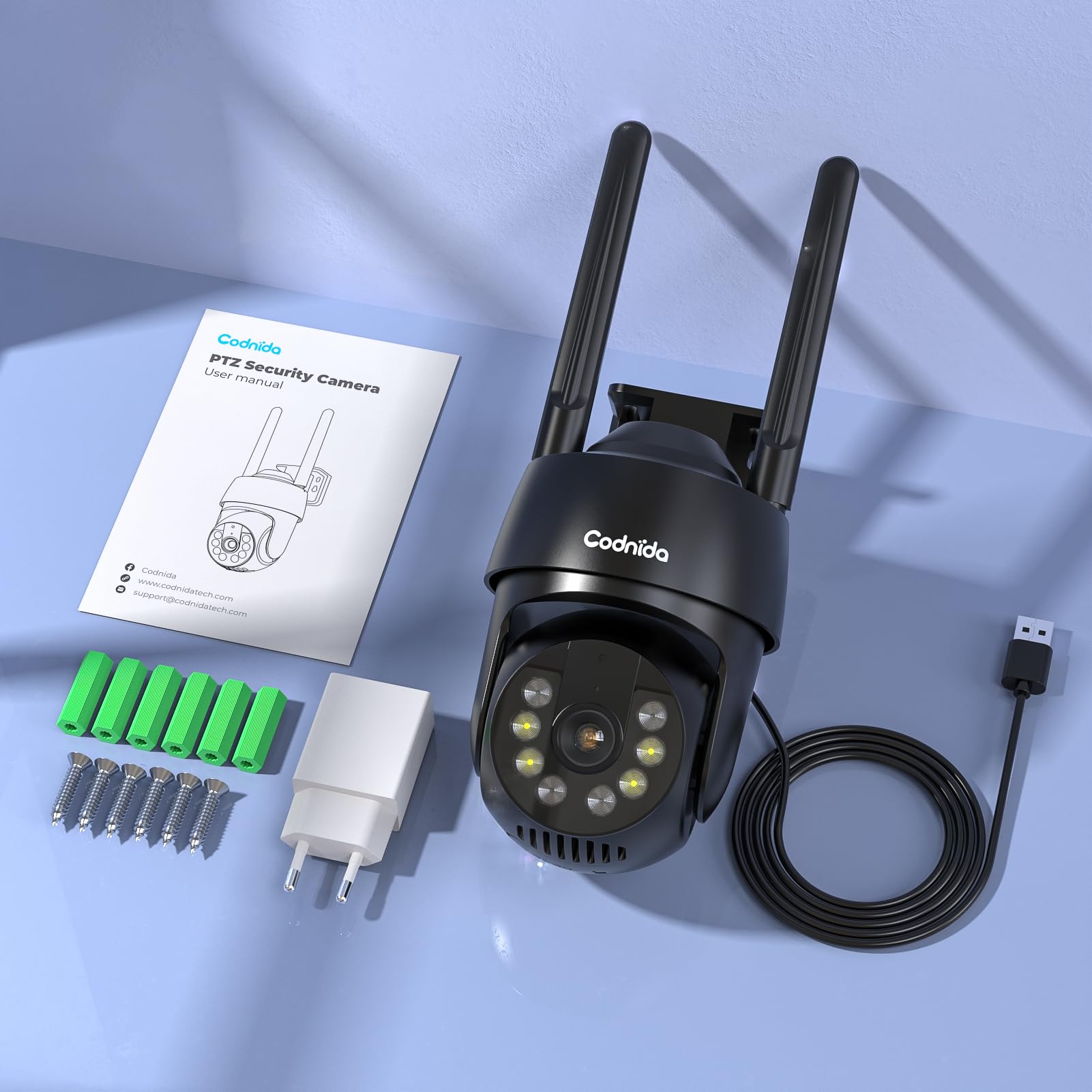 Codnida 2K Security Camera Outdoor, 360° PTZ WiFi Camera, CCTV Camera with 24/7 Recording, PIR Human Detection, Sound and Light Alarm, Support 16-128G SD Card, Works with Alexa