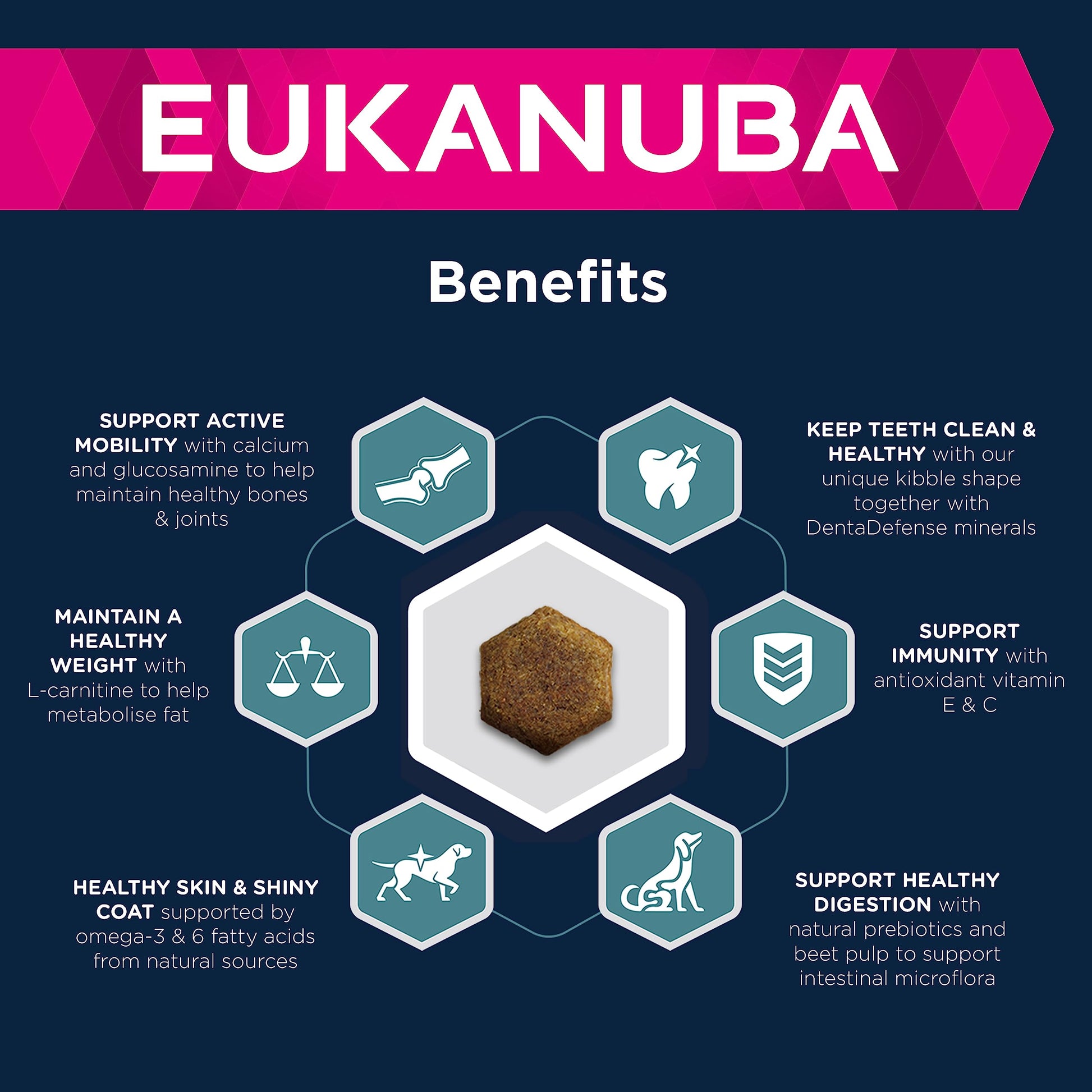 - KIBBLE FOR HEALTHY TEETH: The deposit of tartar on a dog's teeth is not only responsible for bad breath but promotes numerous infectious diseases such as abscesses or gingivitis. The research EUKANUBA has developed and patented Denta Defense. This unique system is very effective in limiting tartar formation. For even more effectiveness, it is combined with a new form of kibble, designed to keep teeth clean and healthy.