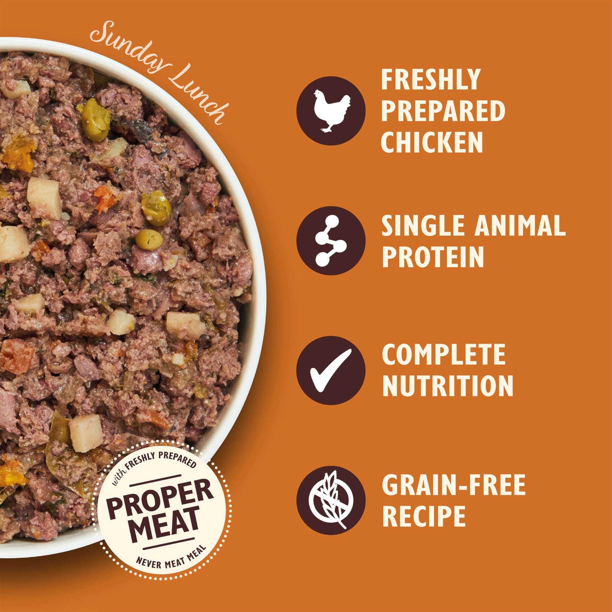 - A mouth-watering variety pack of nutritionally balanced recipes, tinned wet dog food for adult dogs. Made to a grain-free recipe and steam cooked, it includes - Sunday Lunch, Fishy Fish Pie and Wild Campfire Stew