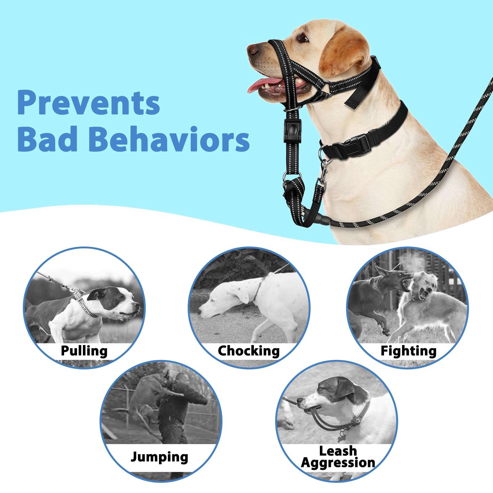 - Improve Visibility: Reflective strips on our pet collars significantly improve your furry friend's visibility in low-light conditions, while reflective strips on head collar for large dogs help keep your dog safe day and night. Dog face harness with reflective straps is designed with durability in mind. Designed with extra reflective stitching, it features robust nylon straps and sturdy stitching. Helps keep dogs of all sizes safe
